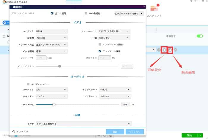 日常系アニメDVDをリッピングするステップ4:「詳細設定」でビデオとオーディオのパラメータを設定して、「編集」オプションで出力効果を編集します。その後、「保存先」オプションへ出力パスを選択します。