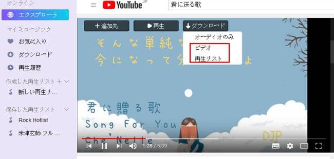 5.「ダウンロード」をクリックして、「ビデオ」を選択してください。プレイリストの場合は「再生リスト」を選択してください。