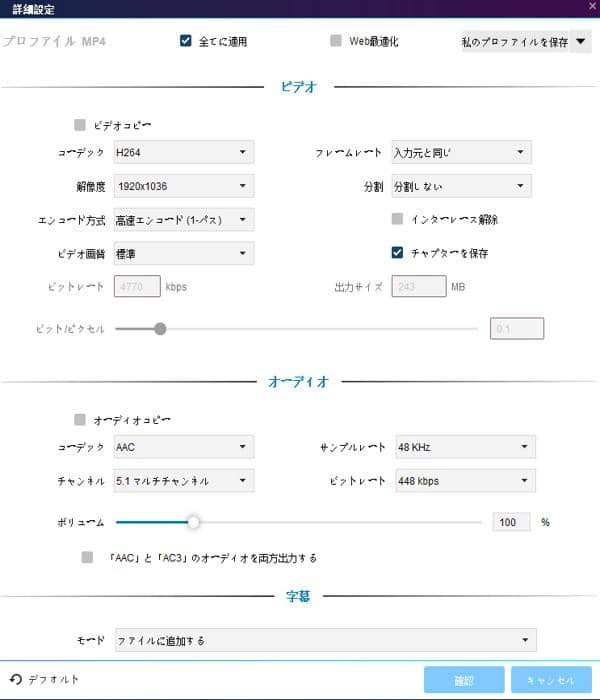 fc2 アニメブルーレイをリッピングするステップ3: 出力ビデオのタイトル、オーディオトラックや字幕を設定します。また「詳細設定」で動画と音声のパラメータを自由に変更でき、「編集」オプションで出力動画をカスタマイズできます。