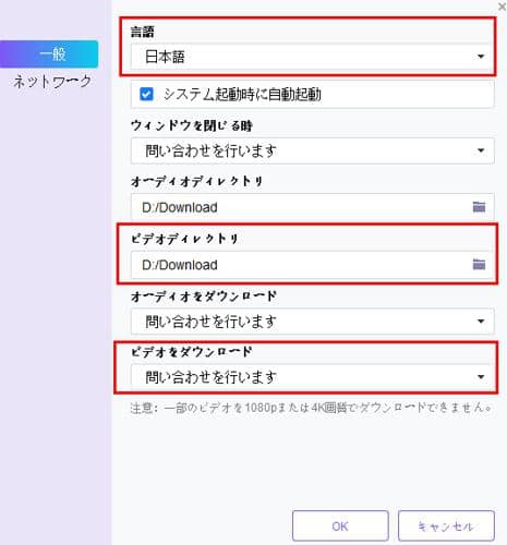 また、ビデオディレクトリで動画を保存する場所を選択できます。「ビデオをダウンロード」で出���品質を144pから8kまで選択でき、全ての動画を同じな出力品質を使用したくない場合は、「問い合わせを行います」を選択してください。そうすると、毎回動画をダウンロードする前に、動画品質を選択するようにポップアップウィンドウが表示されます。