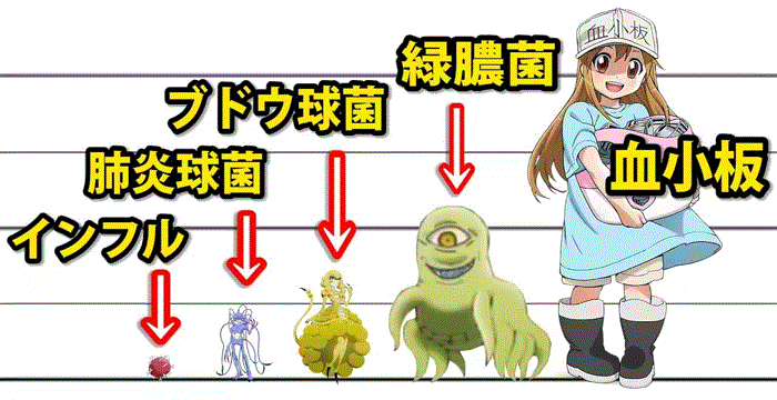 血管壁がすり傷などで損傷した際に、集合して血栓を作り傷口を塞ぐ役割を持つ細胞です。キャラクターの見た目も幼稚園児から小学校低学年くらいの幼い子供の姿をしていて、言動も子供っぽいです。制服はスモックのような大き目のTシャツと半ズボンに長靴、可愛いです。