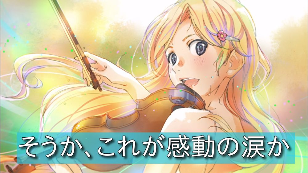 新川直司による日本の漫画を原作としたアニメ作品、2014年秋から放送され、全22話及びOAD1話を含みます。有馬はそもそも音楽界の天才少年ですが、11歳の秋、母が亡くなったことでピアノをを聞こえなくなりました。目標がない彼にとっては、日常生活はつまらなくて何の色もない楽譜だけです。しかし、14歳の春、有馬は宮園かをりという少女に出会います。宮園は性格悪いですが、才能があるヴァイオリニストです。彼女の現れで有馬の心境や日常生活も変わります。