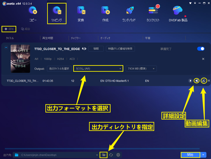 ステップ3:出力ビデオのタイトル、オーディオトラックや字幕を設定します。また「詳細設定」で動画と音声のパラメータを自由に変更でき、「編集」オプションで出力動画をカスタマイズできます。