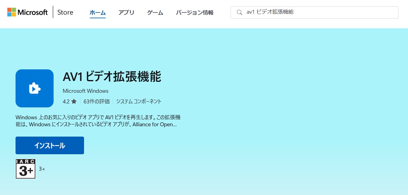 1.Microsoft Storeを開き、「AV1 Video Extension」または「AV1 ビデオ拡張機能」を検索します。