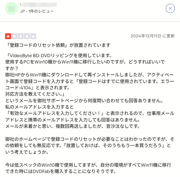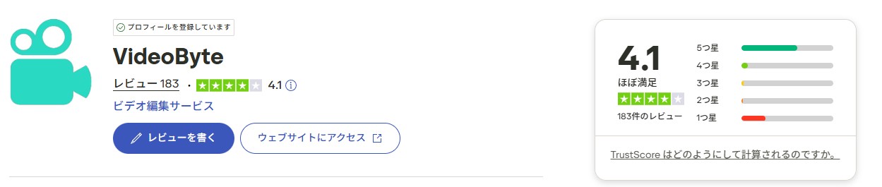 VideoByteはTrustpilotで4.1点の評価を受けており、悪い評価は主にカスタマーサポートの返信がない、または返信が遅いことや、返金に応じないことに集中しています。試用版には透かしが入り、ダウンロード時にウイルス警告が出ることもあります。一方で、製品の変換能力や使いやすさに対する高評価もあります。