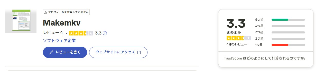 MakeMKVはTrustpilotで3.3点の評価を受けています。レビュー数が少なく、しかも英語なので、ここで日本語に翻訳します。欠点としては、データベースの更新速度が遅いことや変換速度が遅いことが挙げられます。一方、無料で利用でき、実物のディスクを手軽にデジタル化できるのが利点です。また、Twitter上ではMakeMKVがCPRMに対応しておらず、使用できない場合があるとのコメントもあります。