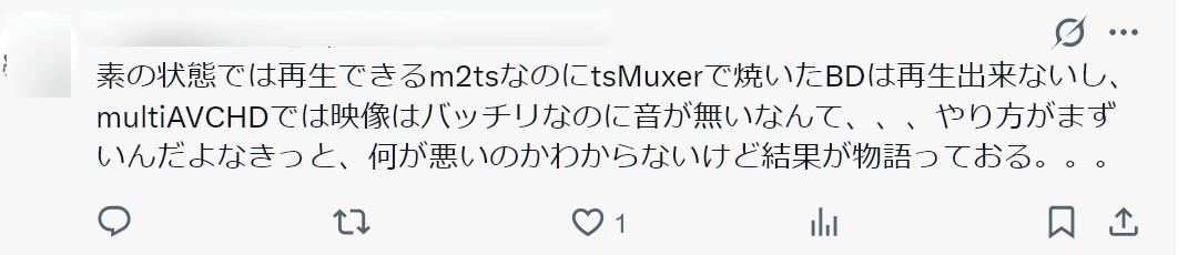 - Blu-ray規格に合わない動画/音声(例:一部のAAC音声など)だとエラーや無音再生が起きることがある