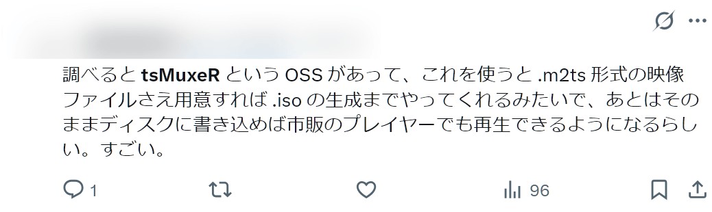 tsMuxeRは、MP4やMKVなどの動画ファイルをブルーレイ形式(BDMVフォルダ)やISOファイルに「無劣化」で変換(Mux)できるフリーソフトです。 動画を再エンコード(圧縮)しないため、画質の劣化が一切なく、変換処理も一瞬で終わるのが最大の特徴です。