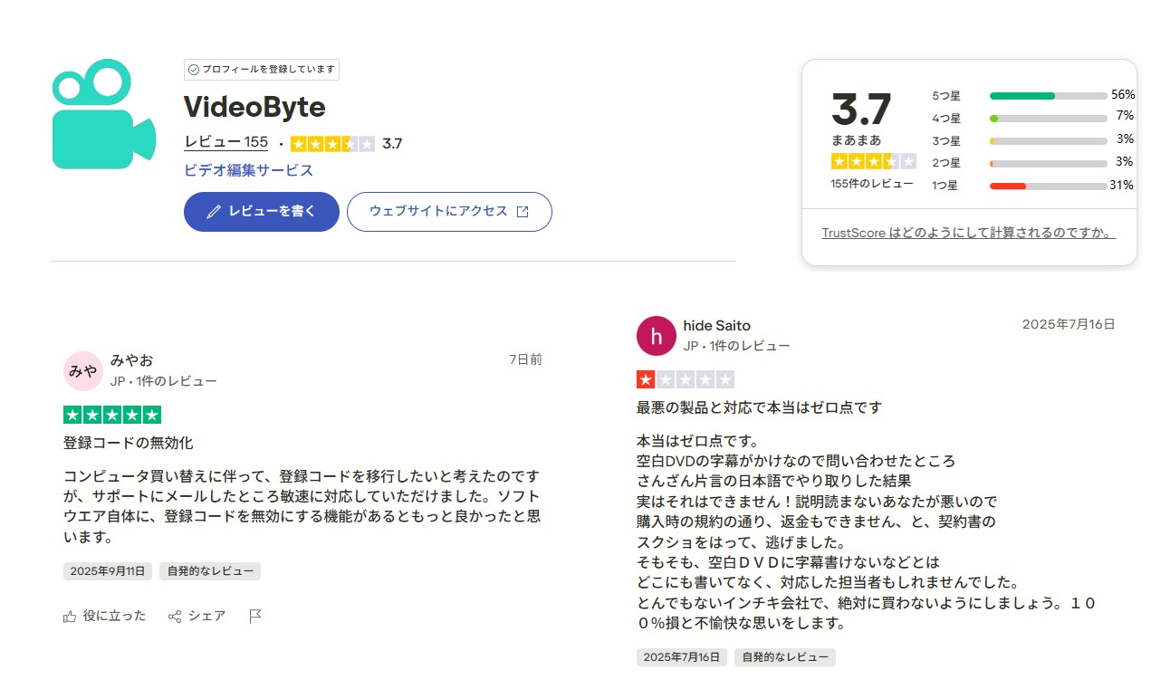 第三方の権威ソフトウェアレビューサイト「Trustpilot」でVideoByteのレビューがただ3.7点(5点満点、更新日:2025/9/19)です。レビューの中に5つ星は56%、1つ星は31%、特にソフトが動作しない場合で返金されない、DVD/BDの読み込みエラー、お客様のメールに対応しないまたは遅れるという悪評が多いです。購入する前に無料版を体験するだけでなく、ネットでよく調査する必要があります。