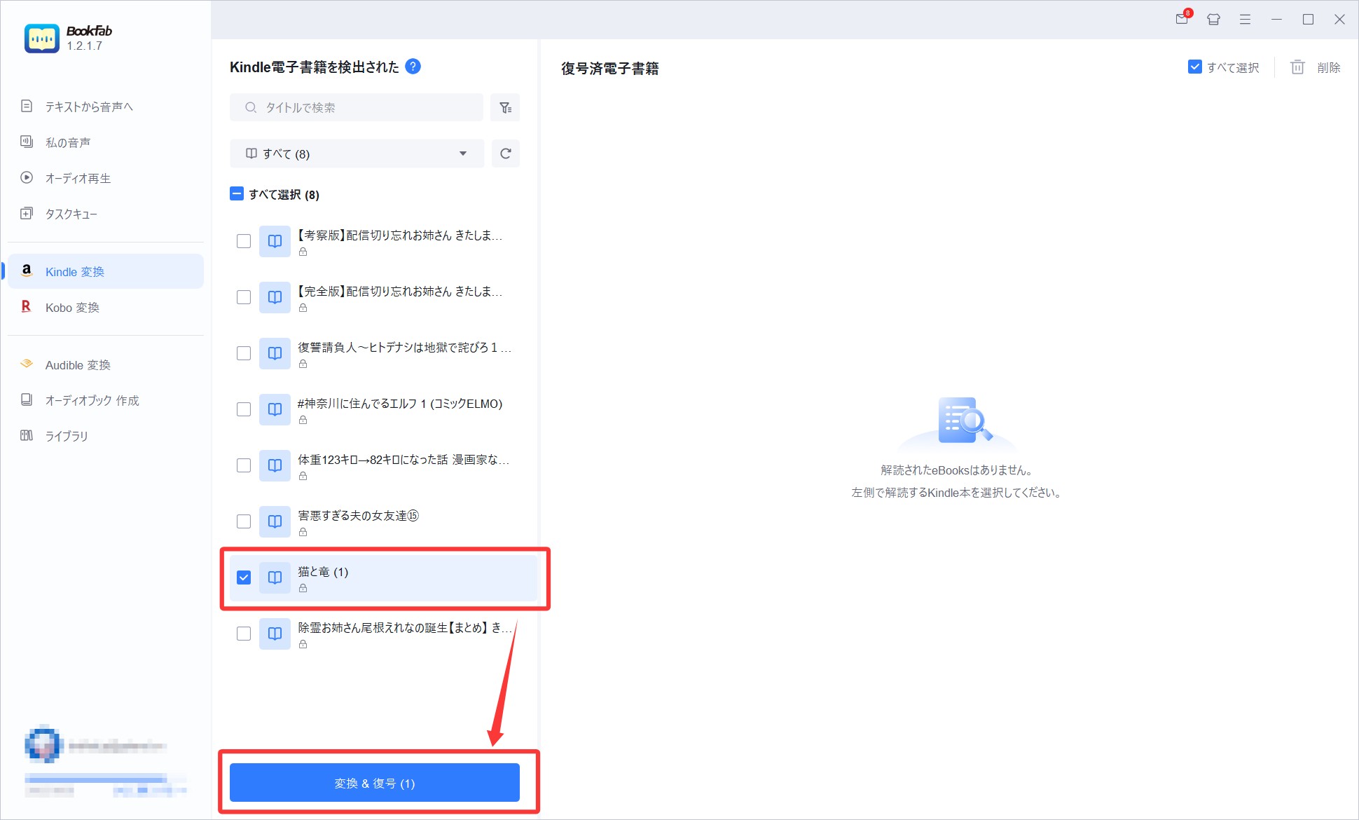 設定が完了したら、変換したい書籍を選択し、画面上の「変換&復号」ボタンをクリックすると、DRM解除と形式変換が同時に開始されます。
