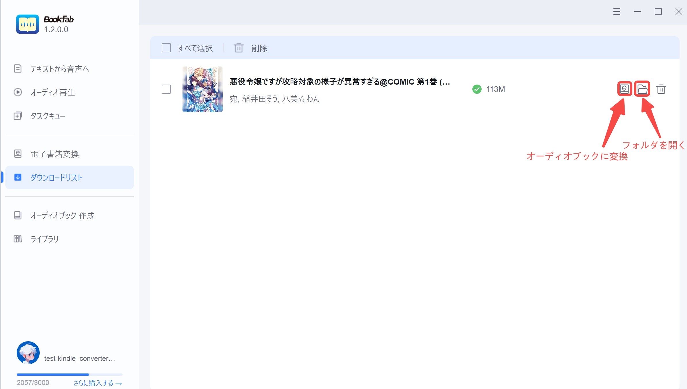 復号済みの電子書籍は、右側に表紙・タイトル・著者名が表示されます。復号済みの電子書籍は、BookFab AudioBook 作成を使ってオーディオブックに変換したり、ローカルフォルダーをすぐに開いて確認したりできます。