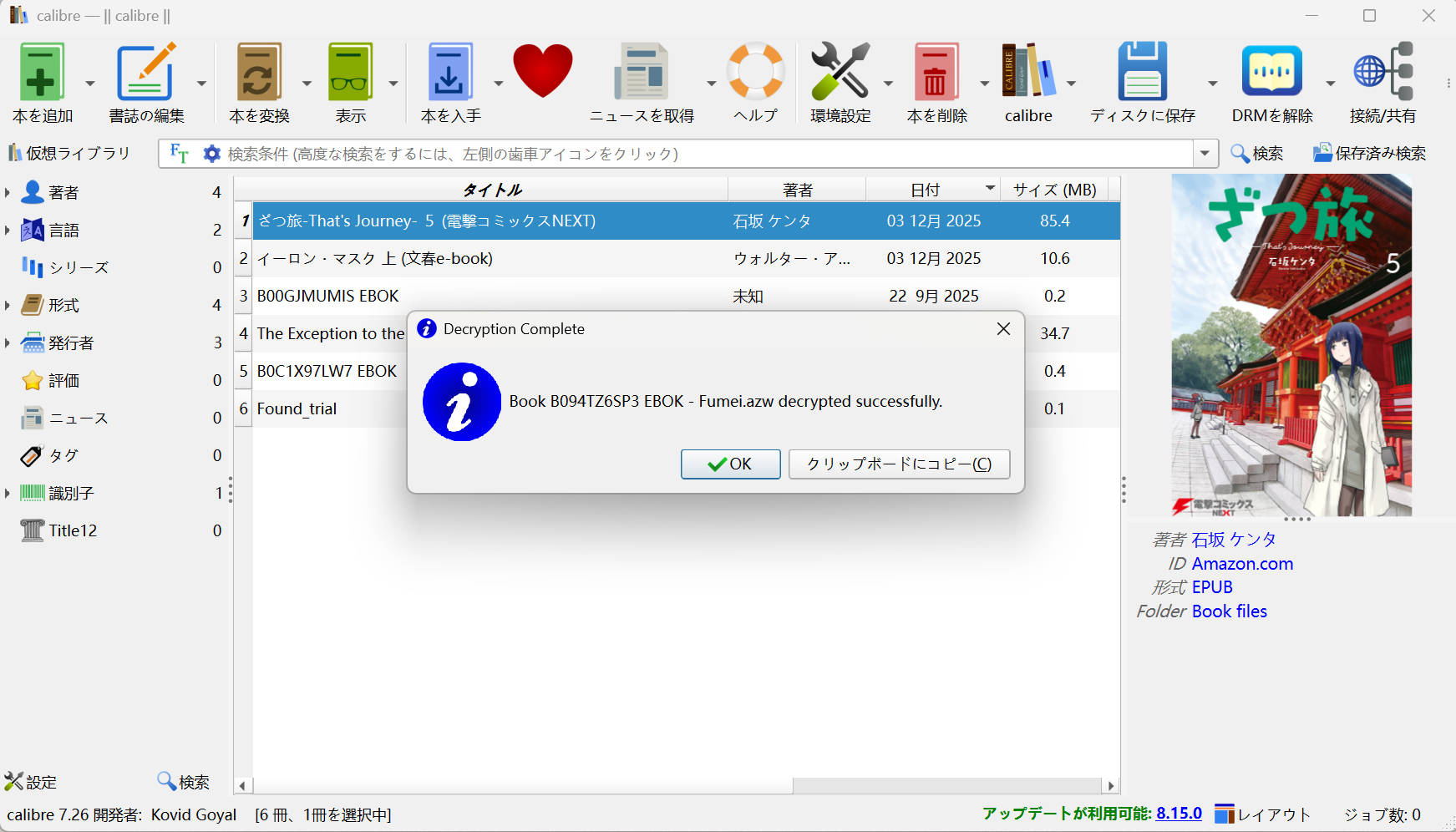 - 復号化が完了後DRMフリーのKindle本を自動的にCalibre ライブラリへ書き戻す