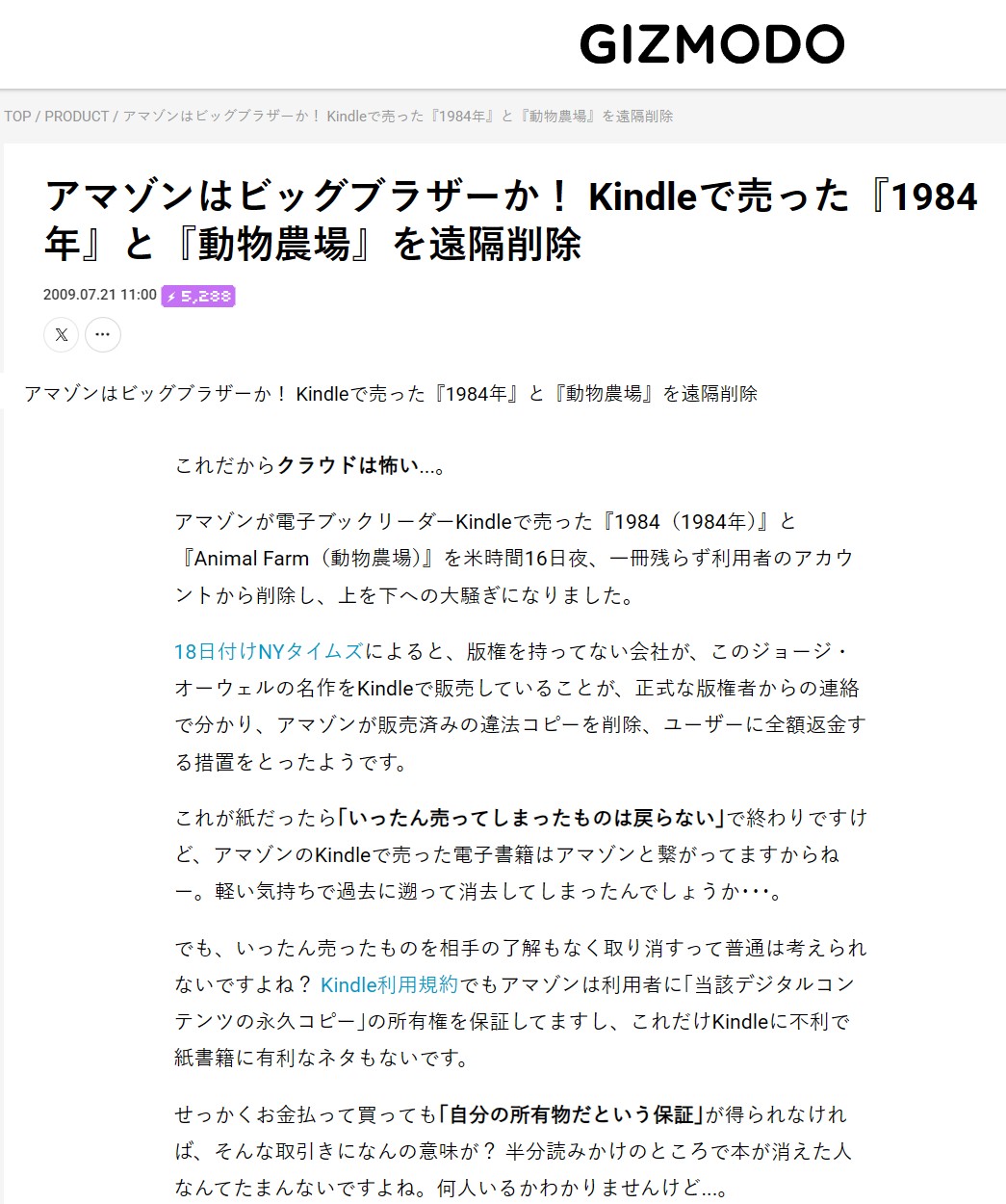 出処:GIZMODOーアマゾンはビッグブラザーか! Kindleで売った『1984年』と『動物農場』を遠隔削除