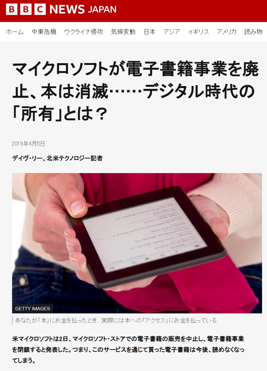 出処:BBC NEWS JAPAN—マイクロソフトが電子書籍事業を廃止、本は消滅……デジタル時代の「所有」とは?