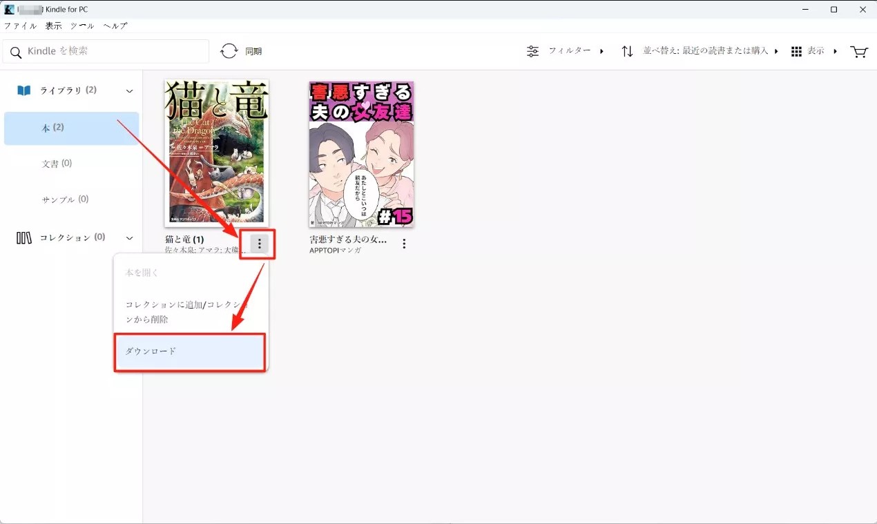 次に「Kindle for PC」を起動し、変換したいKindle電子書籍をPCへダウンロードします。