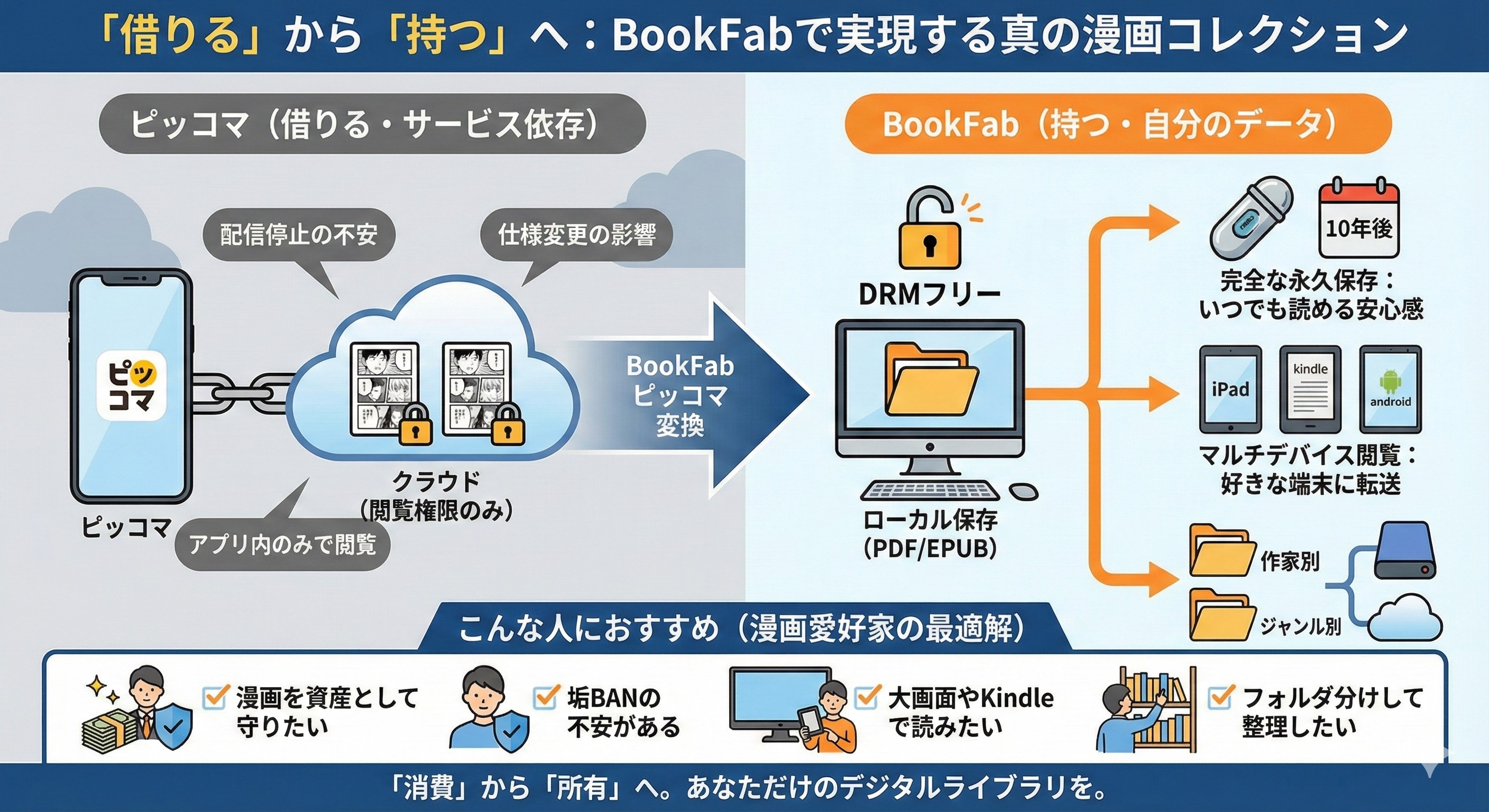 「読むのは便利なピッコマアプリで、保存と管理はPCのBookFabで」。この役割分担を取り入れることで、デジタルコミックにつきまとう「いつか読めなくなるかもしれない」という不安を解消できます。