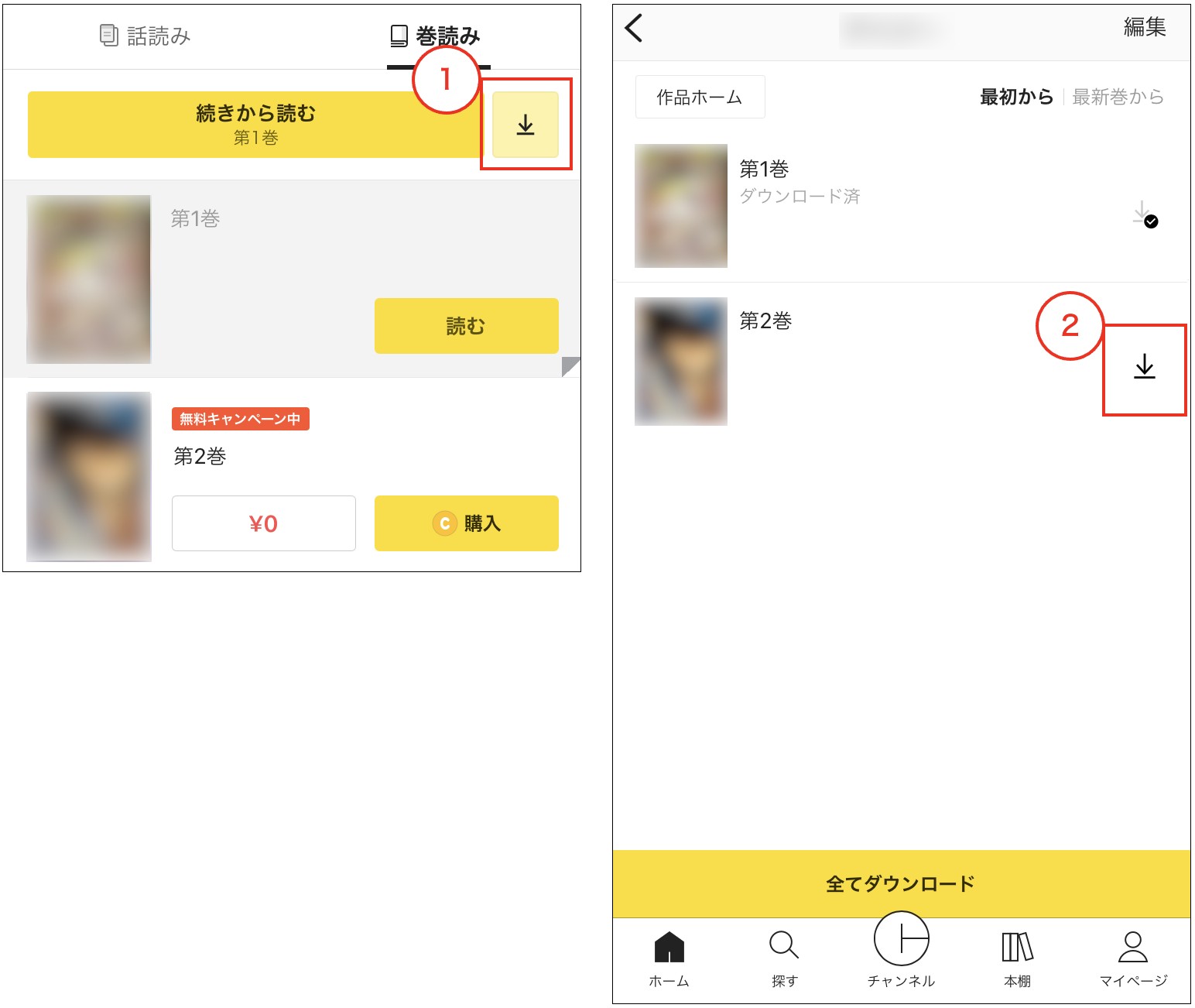 読みたい漫画の作品ページを開き、画面上のメニューや各巻の横にある「ダウンロード」アイコン(下矢印マークなど)をタップします。なお、ダウンロードできるのは「購入済みの巻」や「無料(¥0)対象の巻」に限られます。