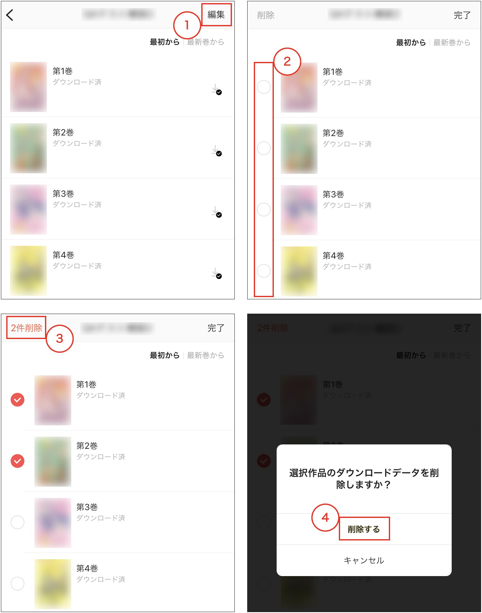 ダウンロードした作品はアプリ内の「ダウンロード一覧」で管理でき、容量を空けたいときは、一覧の右上にある「編集」から巻を選んで削除できます。