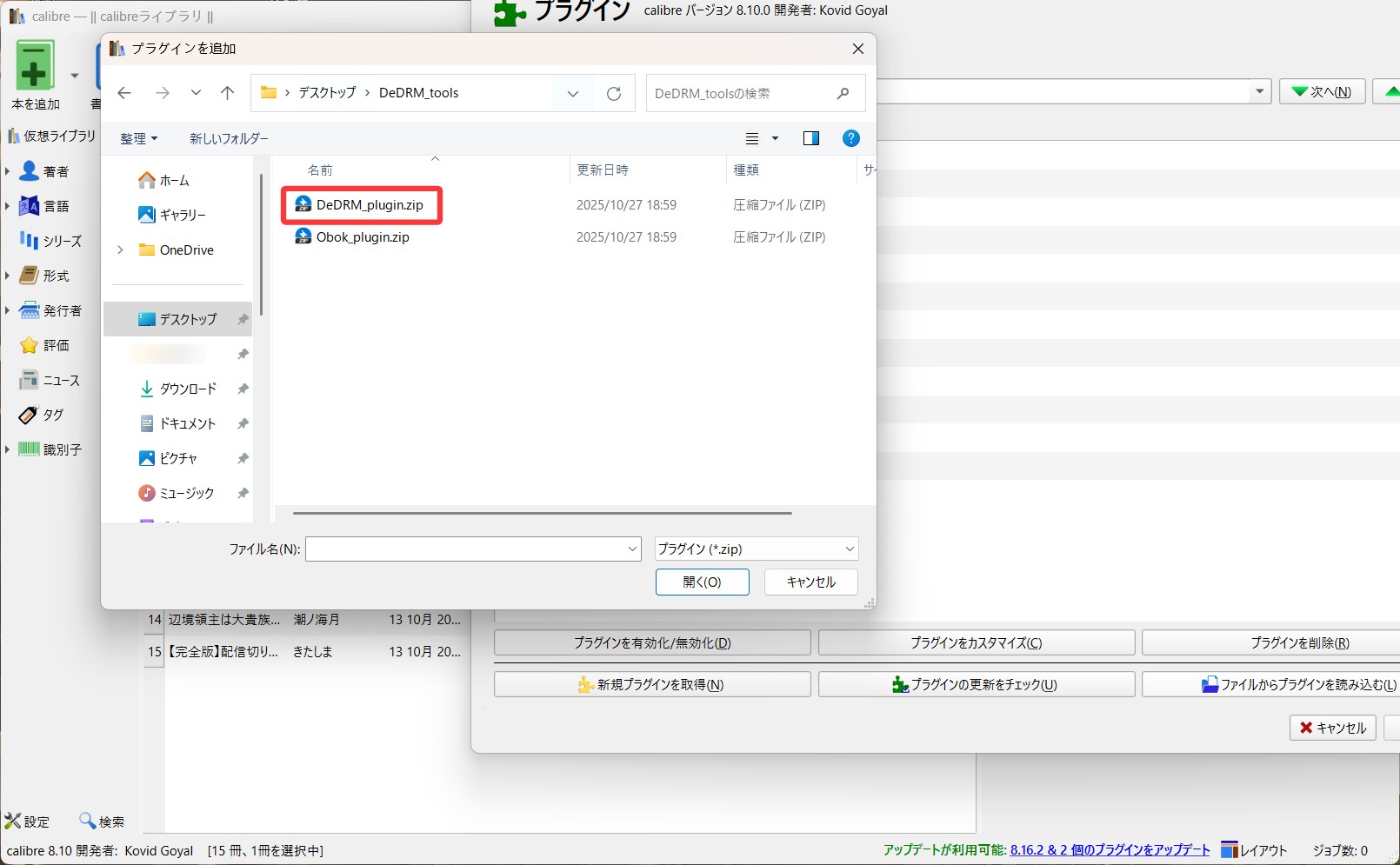 ダウンロードしたZIPファイルの中のDeDRM_plugin.zip を選択(そのまま解凍せず使用)する