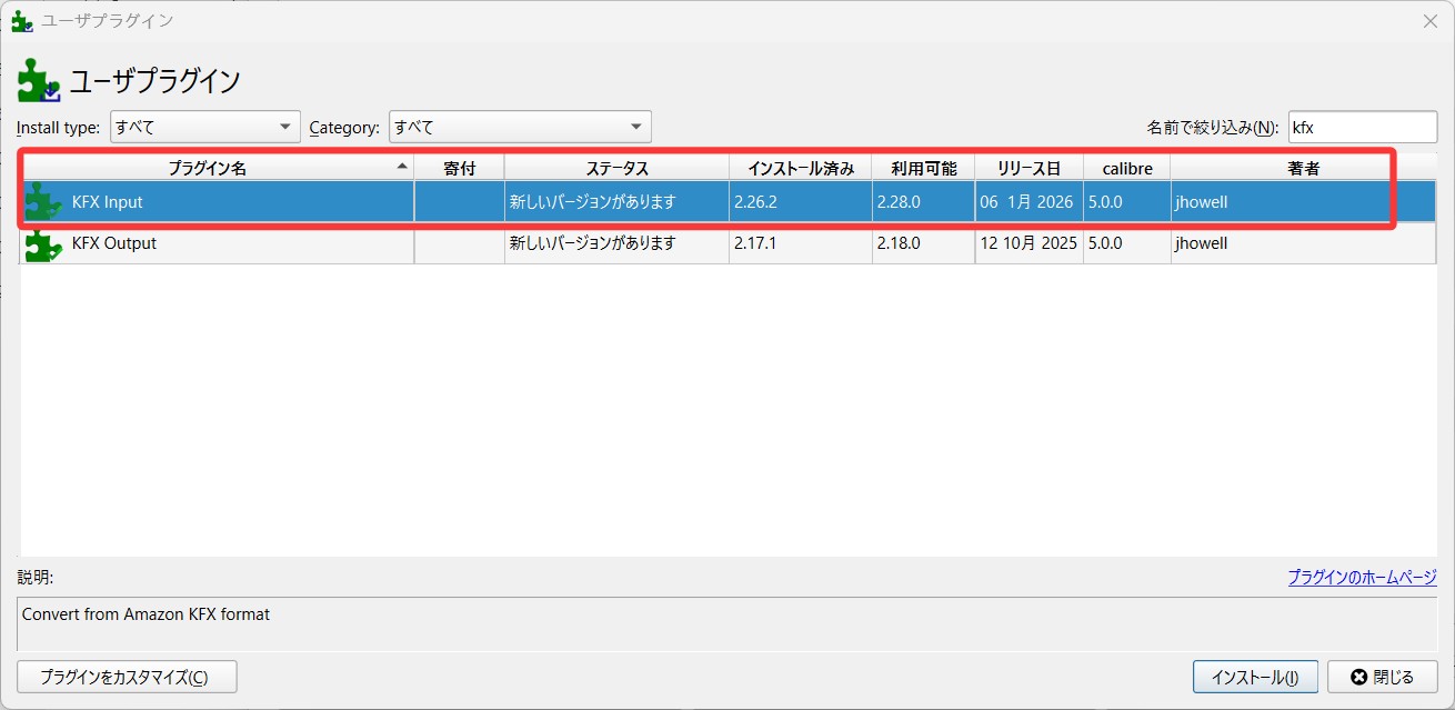 また、KFX Input プラグインは、CalibreにKFX形式を取り込むためのプラグインであり、こちらもCalibreのプラグイン管理画面から取得して導入する必要があります。こうしたプラグインはコミュニティベースで更新されており、対応可否はプラグイン側の更新状況と Amazon の仕様変更のタイミングに左右されやすいという特徴があります。