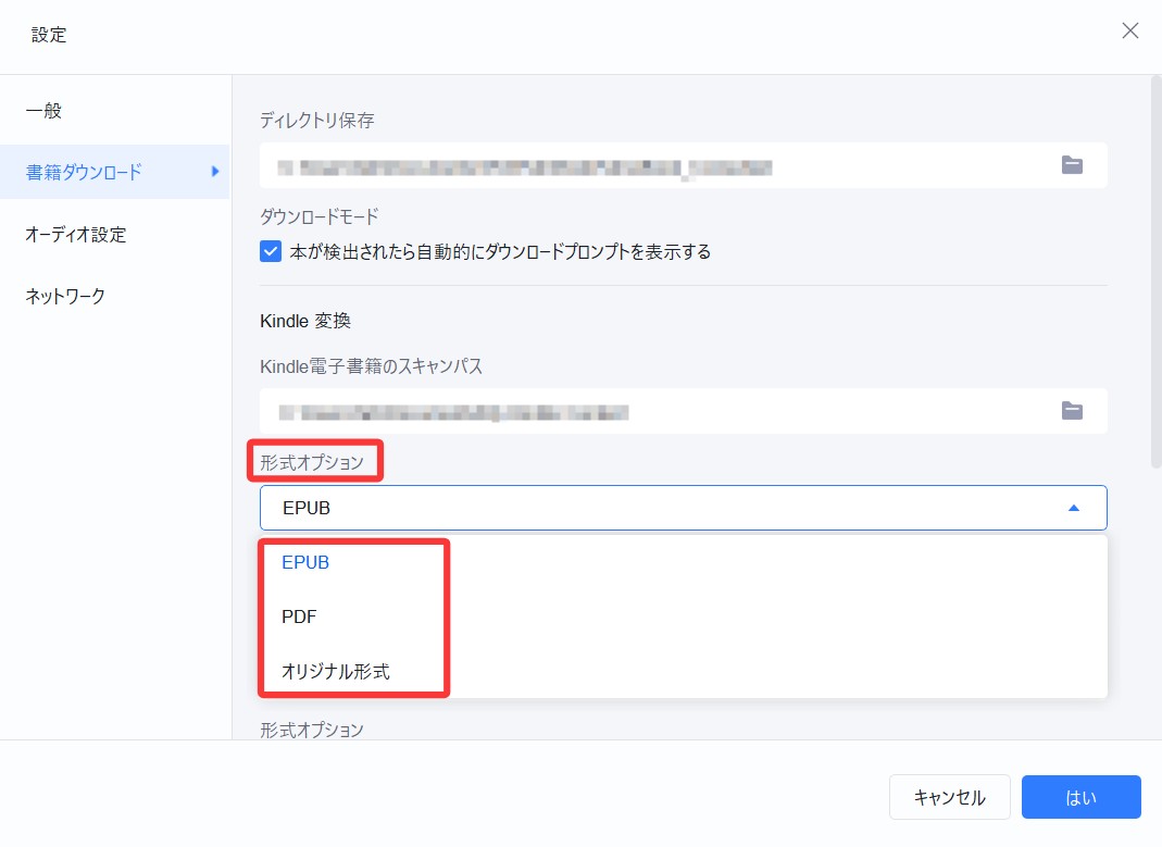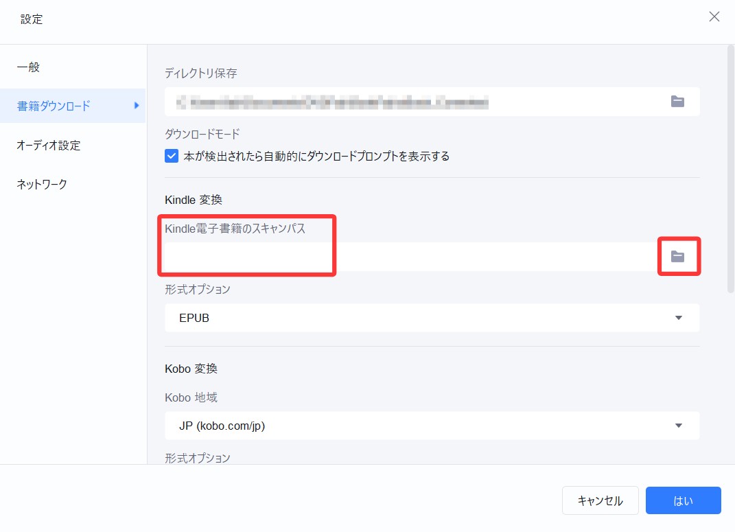 - • 万が一、Kindle for PCから書籍をダウンロードしてもBookFabに表示されない場合は、右上の「設定」から「書籍ダウンロード」を開き、「Kindle電子書籍のスキャンパス」にて、Kindle for PCの保存先フォルダを手動で指定してください。