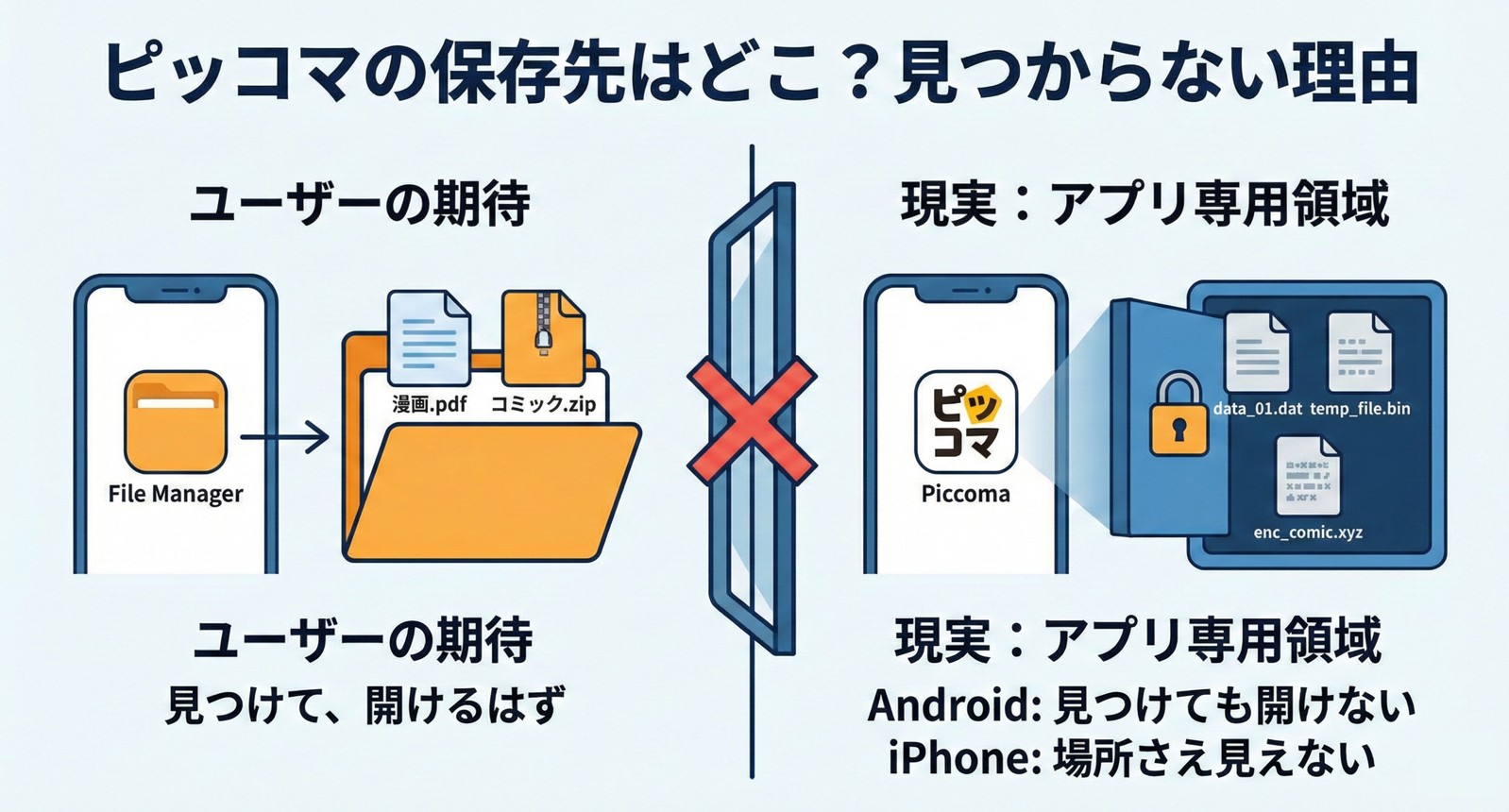 つまり、「保存先が分からない」というより、保存されていても「普通の漫画ファイル」として扱える形では置かれていない、と考えるのが自然です。