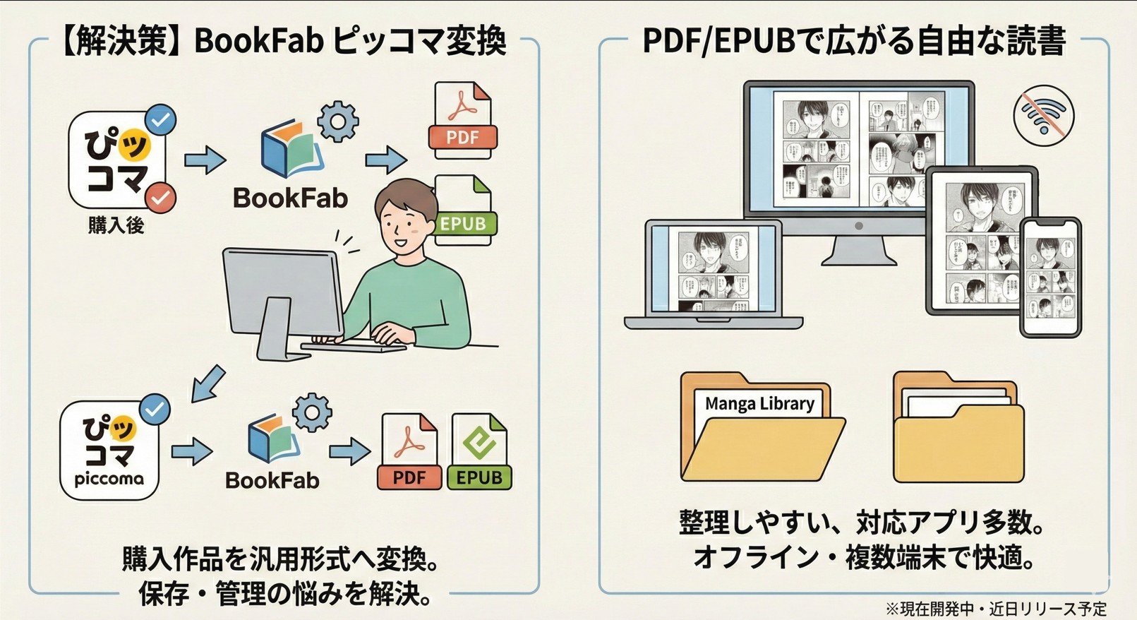 そこで役立つ選択肢として開発されているのが、BookFab ピッコマ 変換です。ピッコマで購入した作品を、PDFやEPUBといった汎用形式に変換し、より扱いやすい形で保存・管理できるようにすることを目的としています。