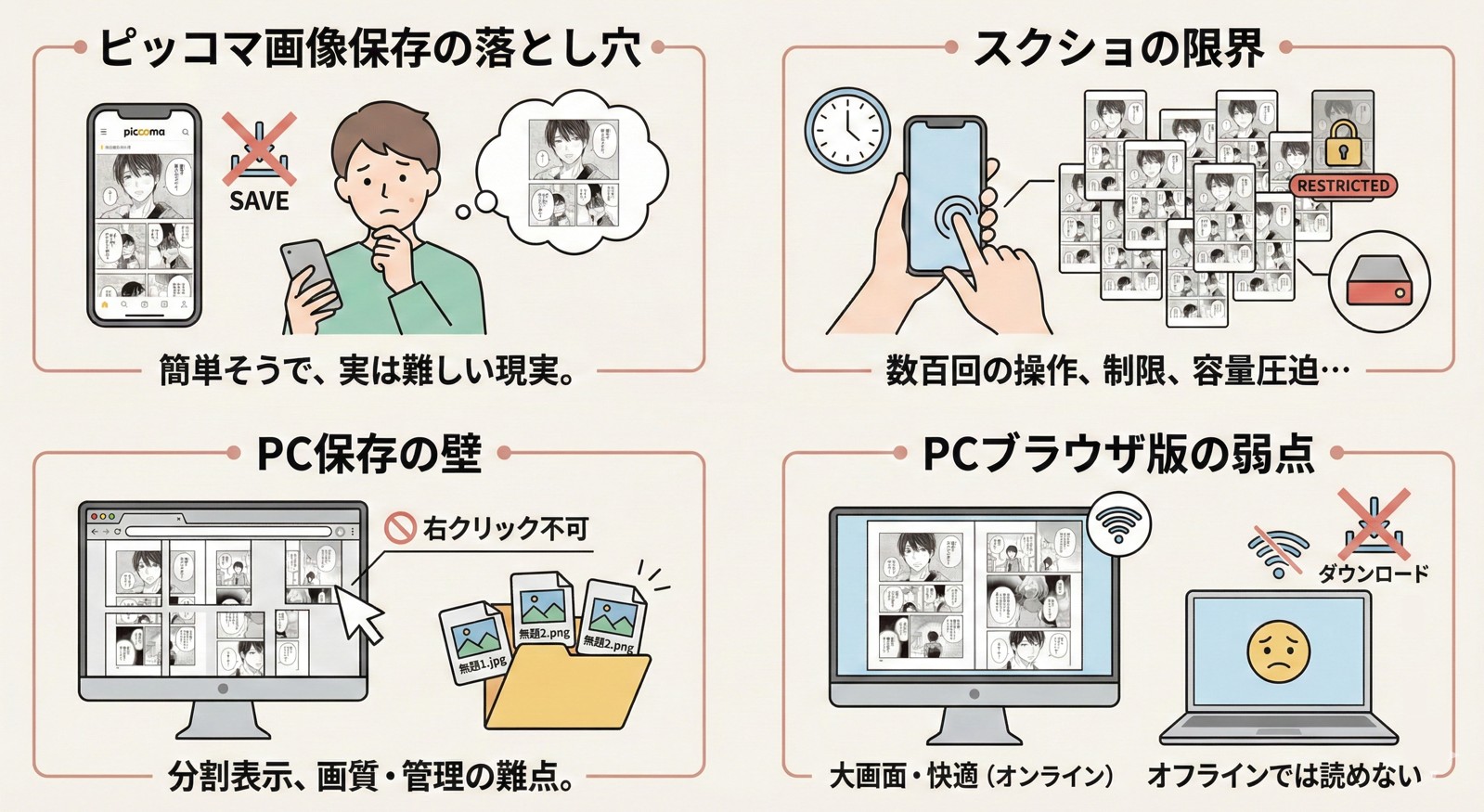 ピッコマはスマホで気軽に読めて、ダウンロード機能もあるため普段の読書には十分便利です。ただ、作品数が増えてくると「あとで探しやすく整理したい」「端末が変わっても同じように読み返したい」といった気持ちが強くなり、保存や管理の面で不便さを感じる場面も出てきます。