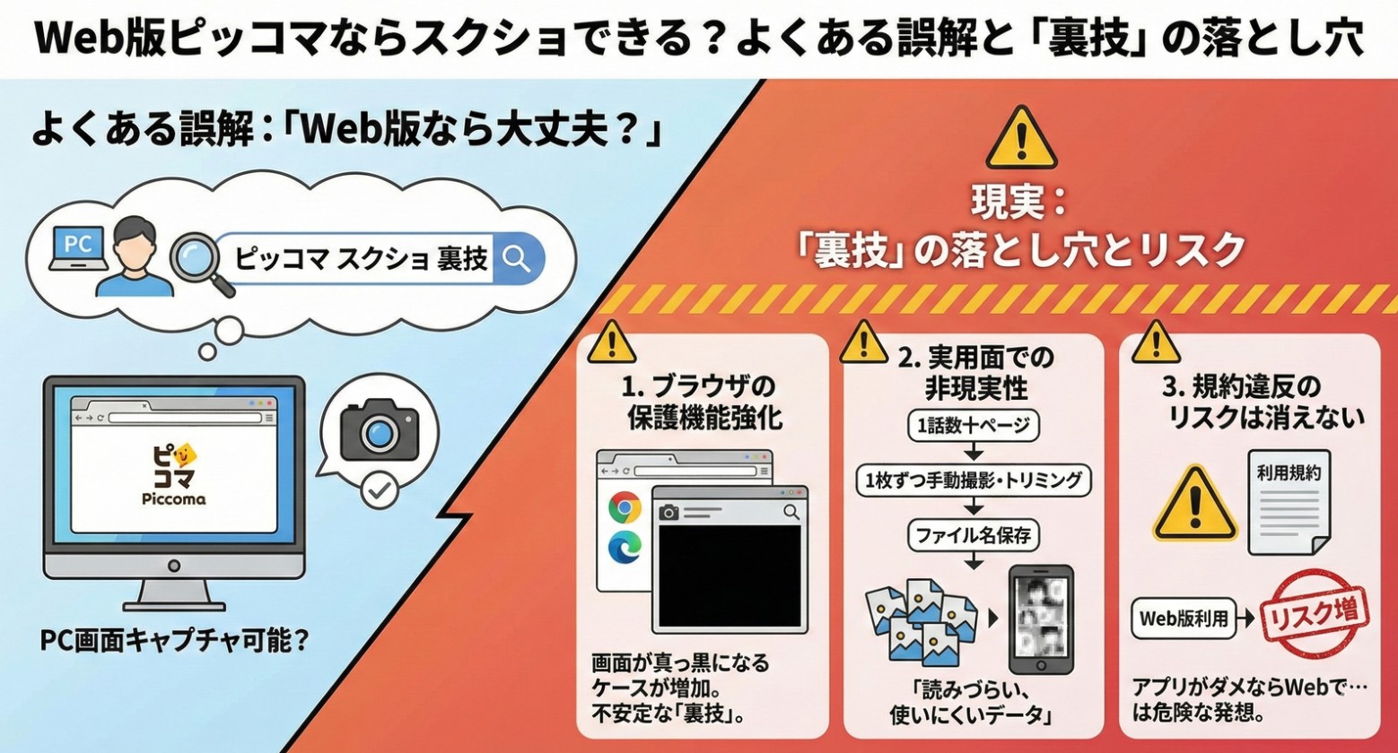 スマホアプリでの制限を知り、「それならPCのピッコマ Web版(ブラウザ)を使えばスクショできるのでは?」と考える人もいます。ネット上には「ピッコマ スクショ 裏技」といった情報も散見されますが、この方法には大きな落とし穴があります。