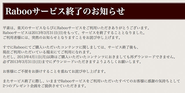楽天直営の電子書籍サービスRabooについて、2012年9月26日に楽天が「2013年3月31日をもって完全終了」と発表した経緯が整理されています。 このような過去の終了事例があると、何か仕様が変わったタイミングで「また終了なのでは?」と連想されやすく、噂や検索が加速しやすくなります。