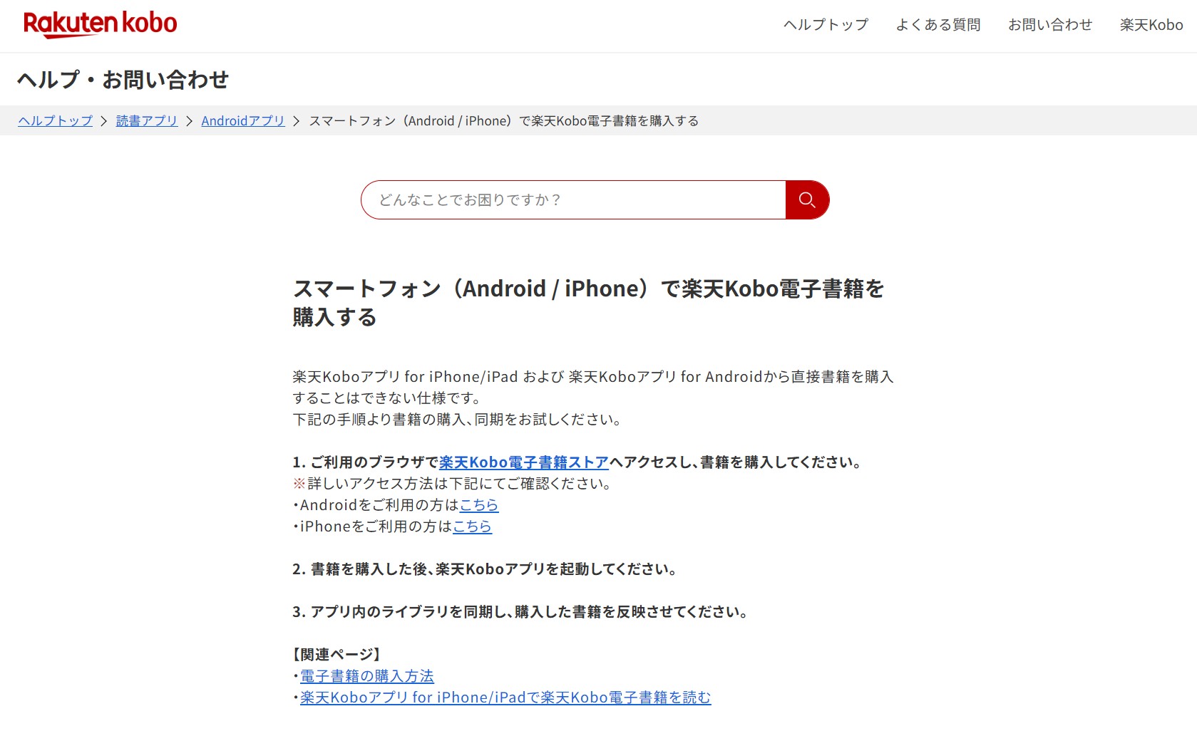 また、iPhone/iPad版・Android版ともに、楽天Koboアプリから直接購入できない仕様であり、ブラウザで購入→アプリを起動して同期という手順が公式に示されています。