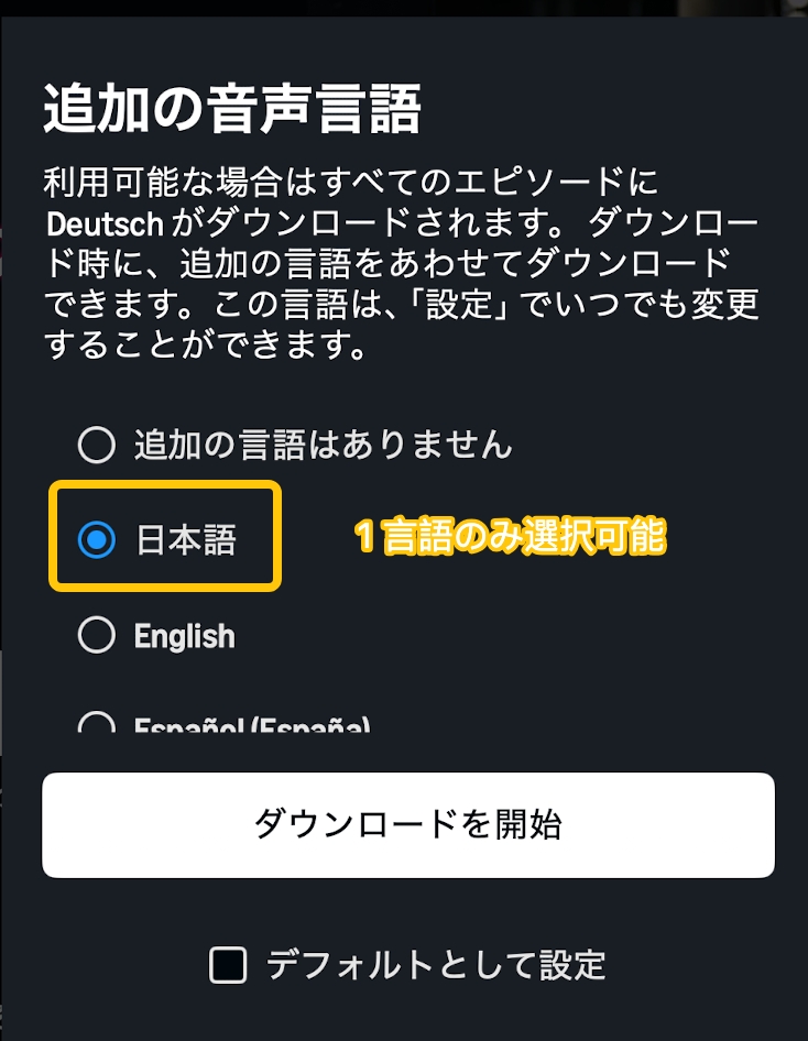 たとえば英語と日本語の両方を同時に保存することはできず、1言語のみ選択可能です。Netflixもほぼ同様で、ダウンロード時には再生時言語が1種類だけ埋め込まれます。