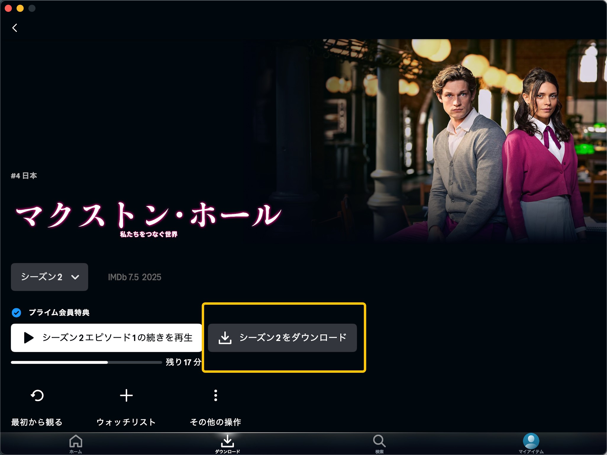 それでは、実際のPCでのアマプラダウンロード手順を見てみましょう。ここでは、テスト環境としてmacOS Sequoia 15.3.2を使用し、回線速度21Mbps・作品「マクストン・ホール」第2シーズン第1話で検証しました