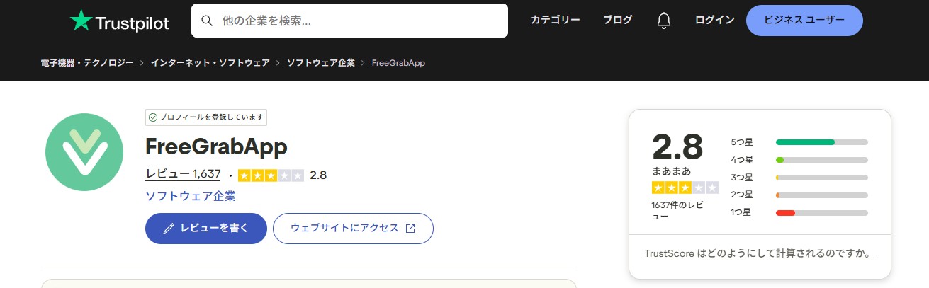 FreeGrabApp のTrustpilotページには「ソフトウェア企業」としてのプロフィールと連絡先(メール/公式サイト)が記載。総合評価は「2.8(まあまあ)」、レビュー件数は約1,600件台。企業側は「ネガティブレビューの93%に通常1週間以内で返信」と表示されています。