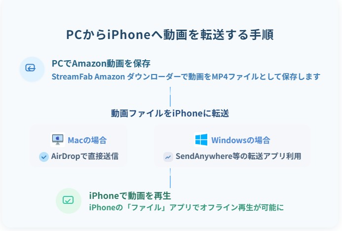 StreamFabでダウンロードした動画をiPhoneに転送すれば、iPhoneのファイルアプリにアマゾンプライムビデオを保存してオフライン再生ができます。