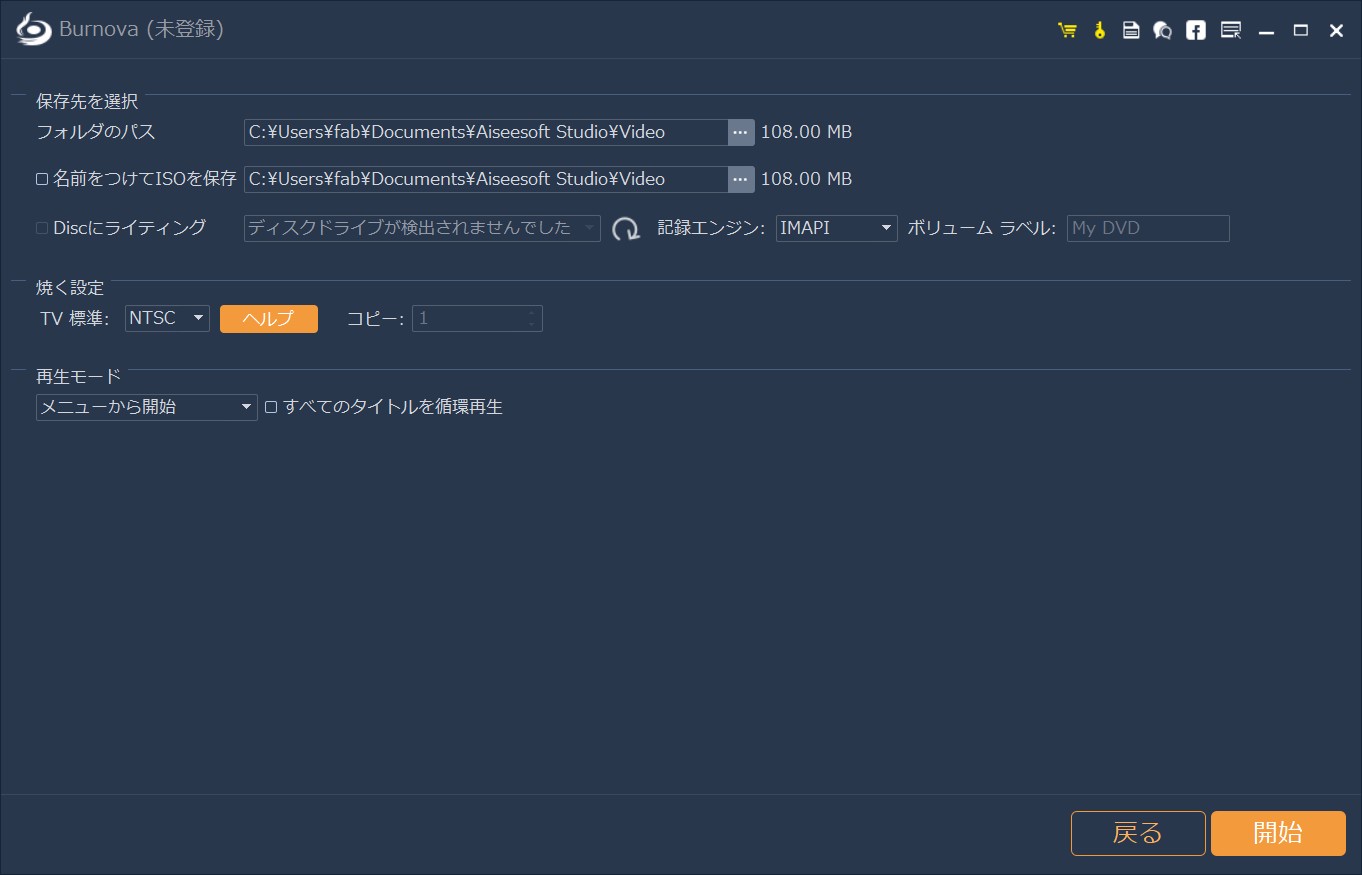 5.保存先を指定し、開始ボタンを押すとDVDの作成が始まります。また、ISOファイルとして保存することも可能です。