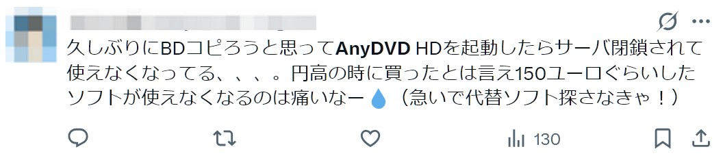 5ちゃんねる掲示板やX(旧Twitter)などのSNS上でも、AnyDVDに関する不具合報告やサービス停止を疑う声が相次いでいます。