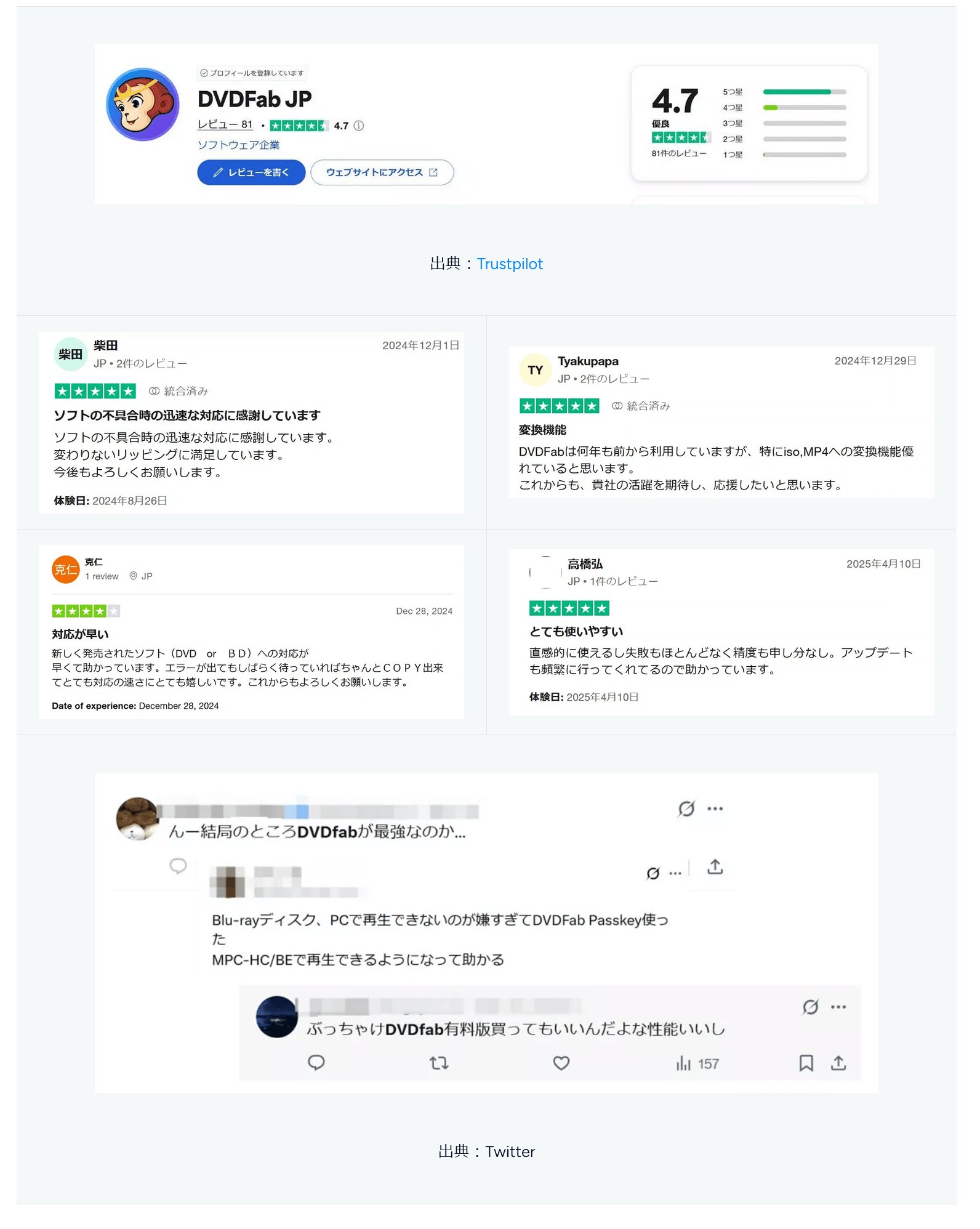 DVDFabはTrustpilotで、満点5点中4.7点という高評価を獲得しており、同種の製品の中でも特に評価が高いです。多くの熱心なユーザーがいて、操作が簡単で処理速度が速く、問題解決も迅速だと好評です。DVDFabは長年にわたる研究開発の経験があり、信頼できるブランドです。また、新しいDVDやBlu-rayへの対応が早いため、アップデートがやや頻繁になることがあります。