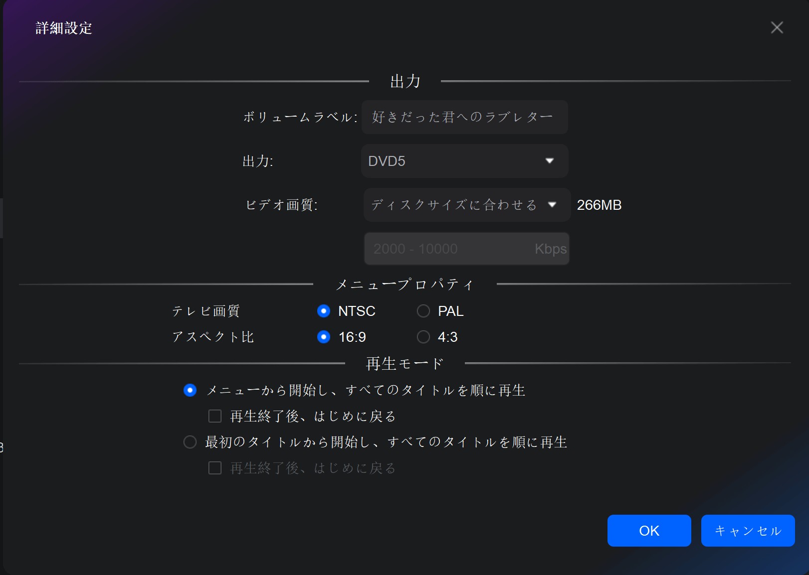 出力をDVD5またはDVD9に設定します。字幕、音声なども設定できます。