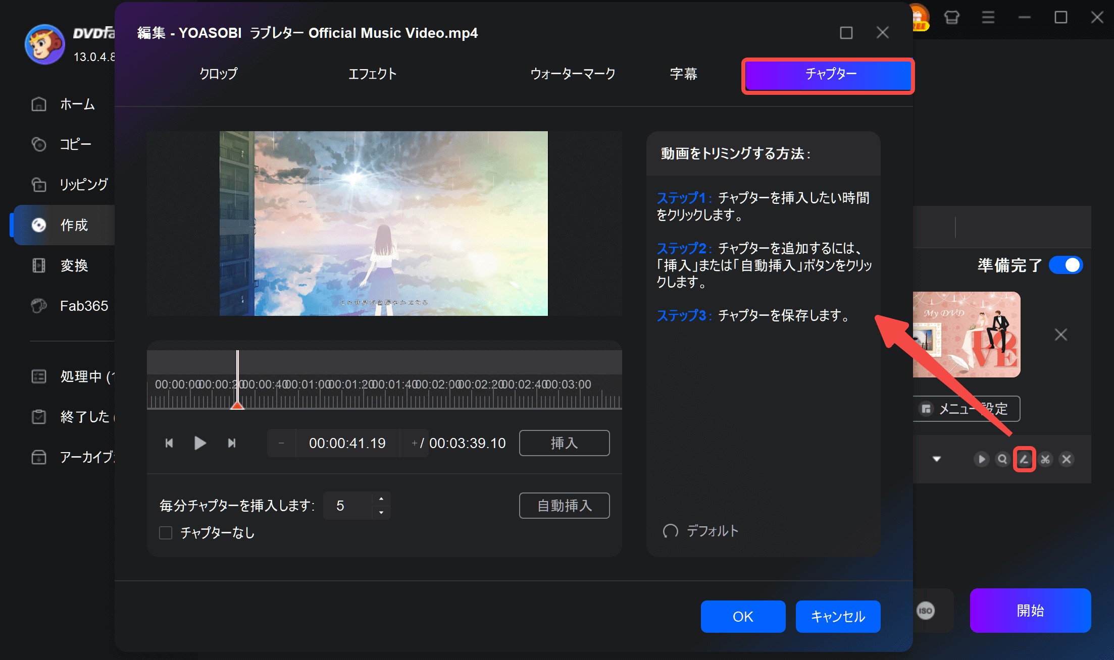 DVD FlickやDVD Stylerなどはチャプター作成に対応しています。また、DVDFabも詳細設定で「チャプターを保存」にチェックを入れることでチャプターの作成ができます。