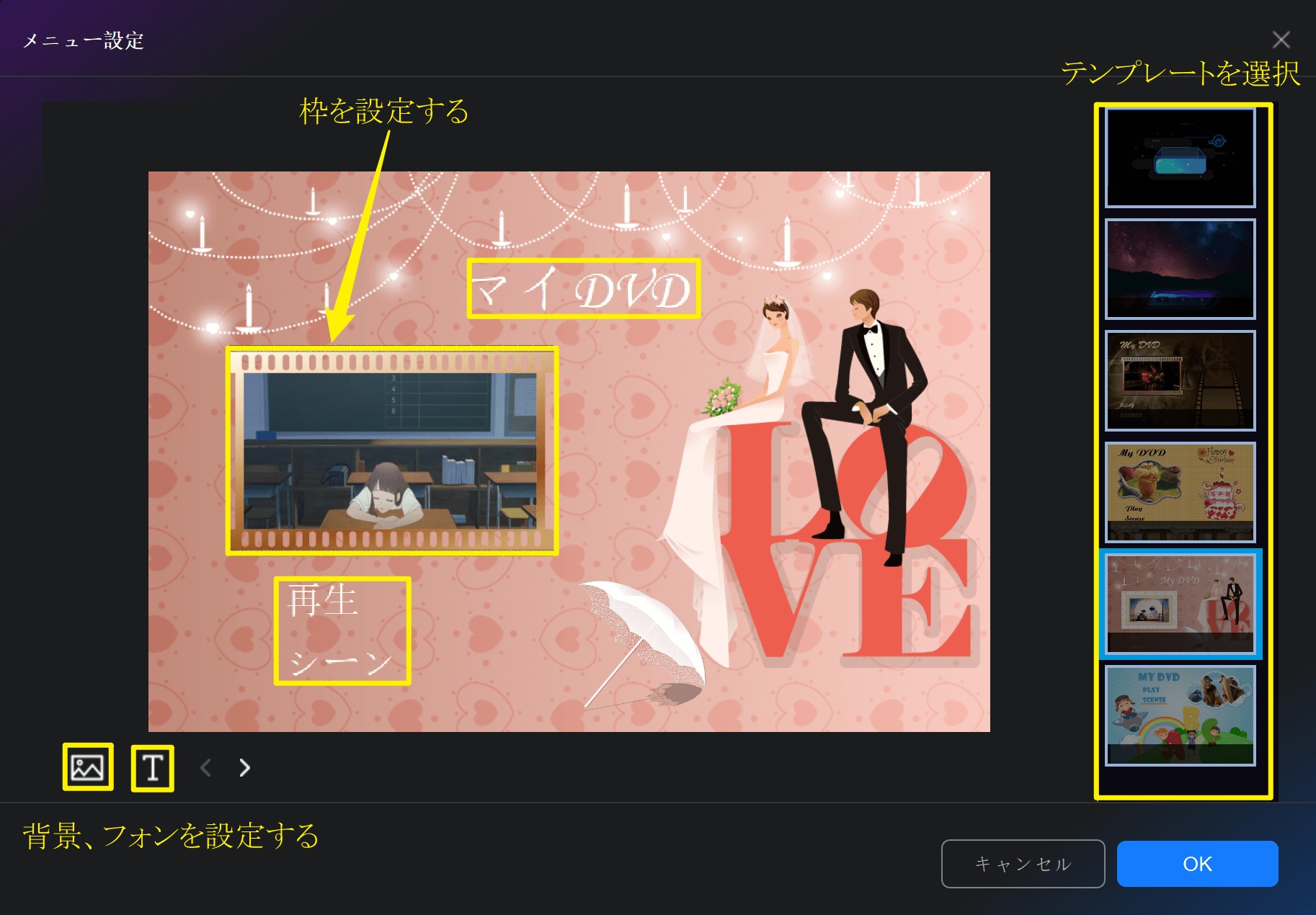 多くのオーサリングソフトでは、テンプレートを選ぶだけで両方のメニューが自動生成され、背景画像やBGMを自由にカスタマイズできます。