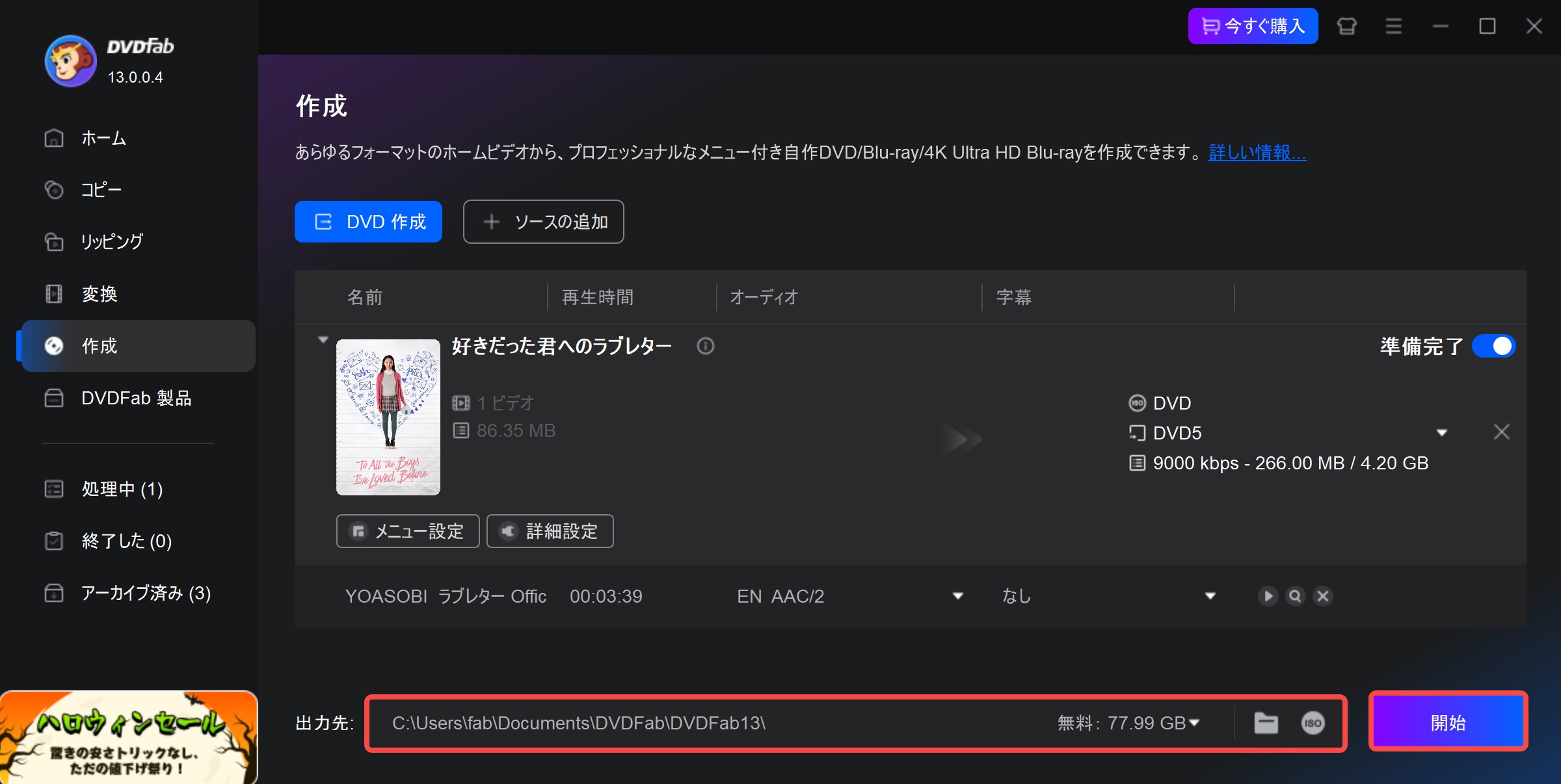 | 出力形式 | DVD 5、DVD 9、BD-25、BD-50、BD-100 など |