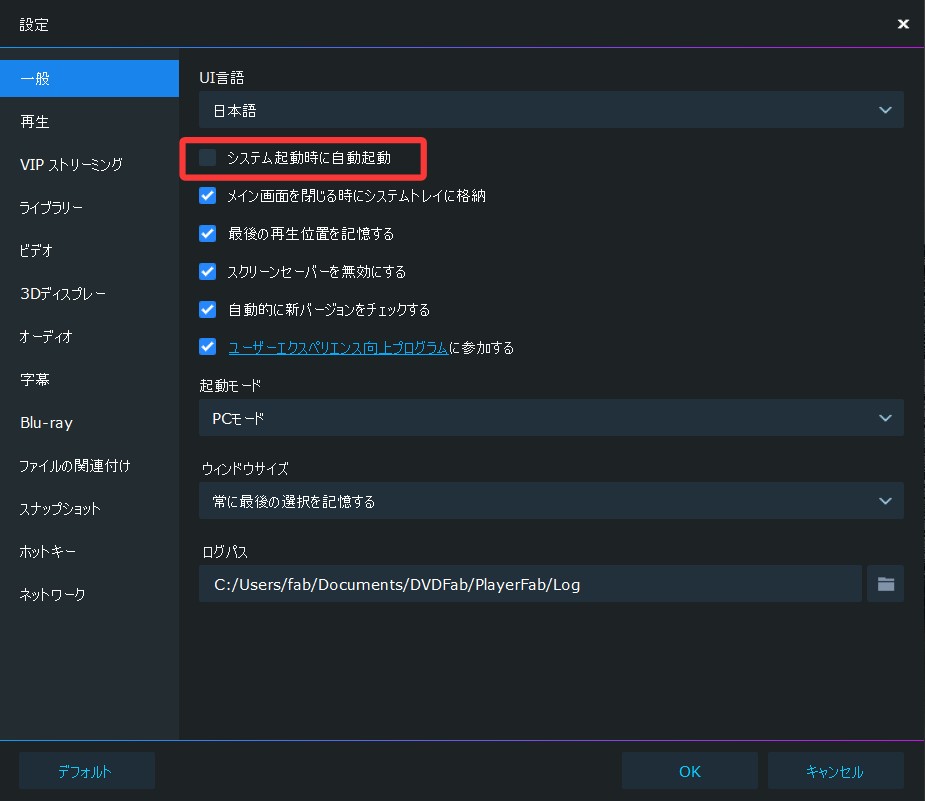 なお、PlayerFabの初期設定では、システム起動時に自動起動するようになっていますが、画面右上のメニューから「設定」を選択し、「一般」の中でその機能のチェックを外すことで解除できます。