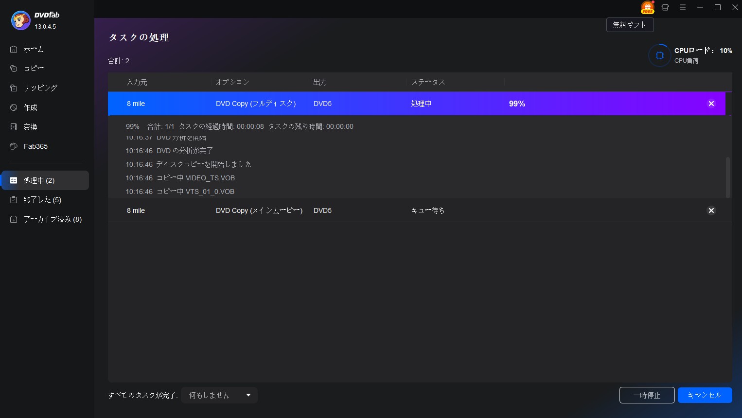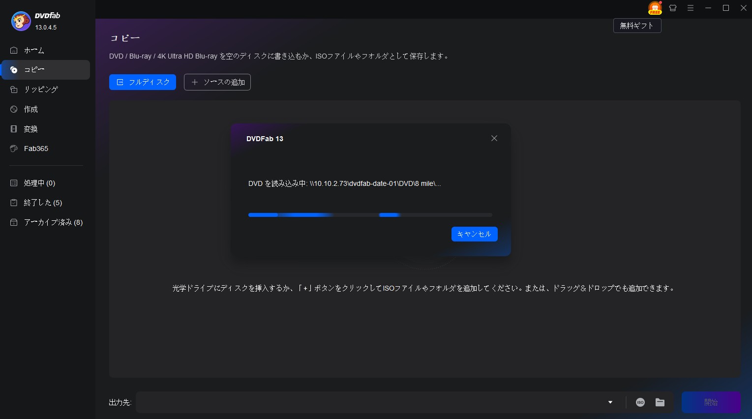 画面右下の「開始」ボタンをクリックすれば、DVDのコピーが開始されます。「処理中」で進捗状況が見られます。