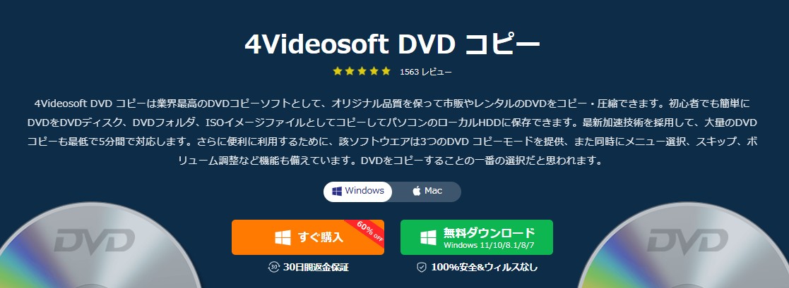 4Videosoft Copy | Win / Mac | フル/メイン/カスタム、圧縮、ラベル設定 | 初心者〜中級 | オーソドックスで安心感 | 定番UIで迷わない、実用性高い | ISO/DVDフォルダ/ディスク |