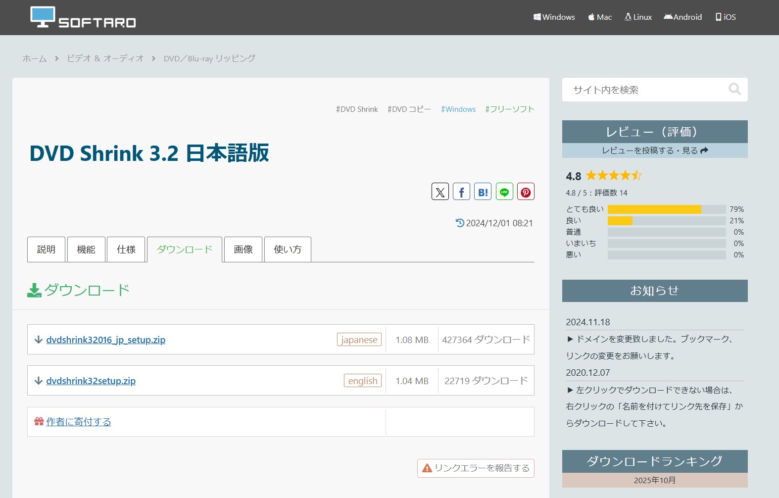 そのため、配布元の信頼性の確認が極めて重要です。実際、2014〜15年には「DVD Shrink日本語版」を無断で配布していたサイトの運営者が著作権法違反で警告を受けた記録もあります。ダウンロード・インストールを行う際は、次の点にご注意ください: