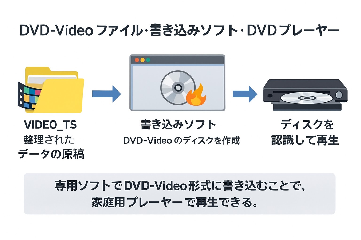 DVDを作成して家庭用プレーヤーで再生する仕組みは、一見複雑に見えますが、実際には「データ」「加工する人」「読む人」という三つの役割がうまく連携するだけのシンプルな構造です。