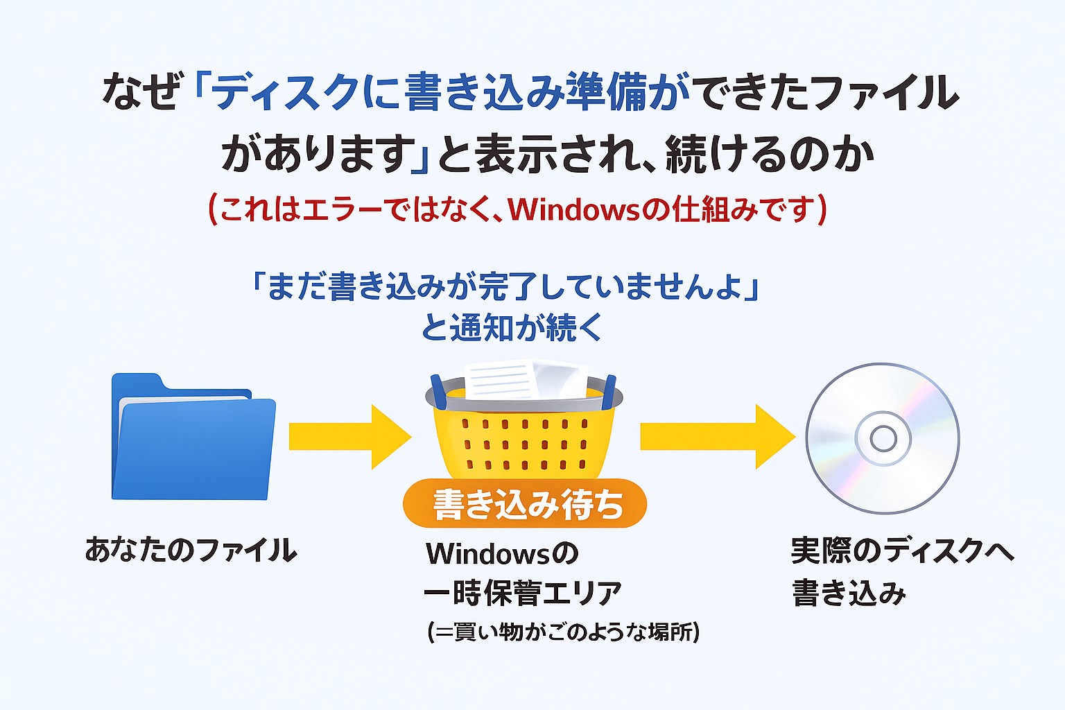 Windowsの「ディスクに書き込む準備ができたファイル」通知は、エラーではなく、Windowsの仕組みによる単なるお知らせです。ファイルをCD/DVDドライブへドラッグしてもすぐに書き込まれるわけではなく、まず「一時保管エリア(ステージングエリア)」にコピーされ、書き込み待ちの状態になります。これは、ネット通販で商品を「買い物かご」に入れたままレジに進んでいない状況と同じで、Windowsは「保管エリアにまだファイルがあります」と通知しているだけです。