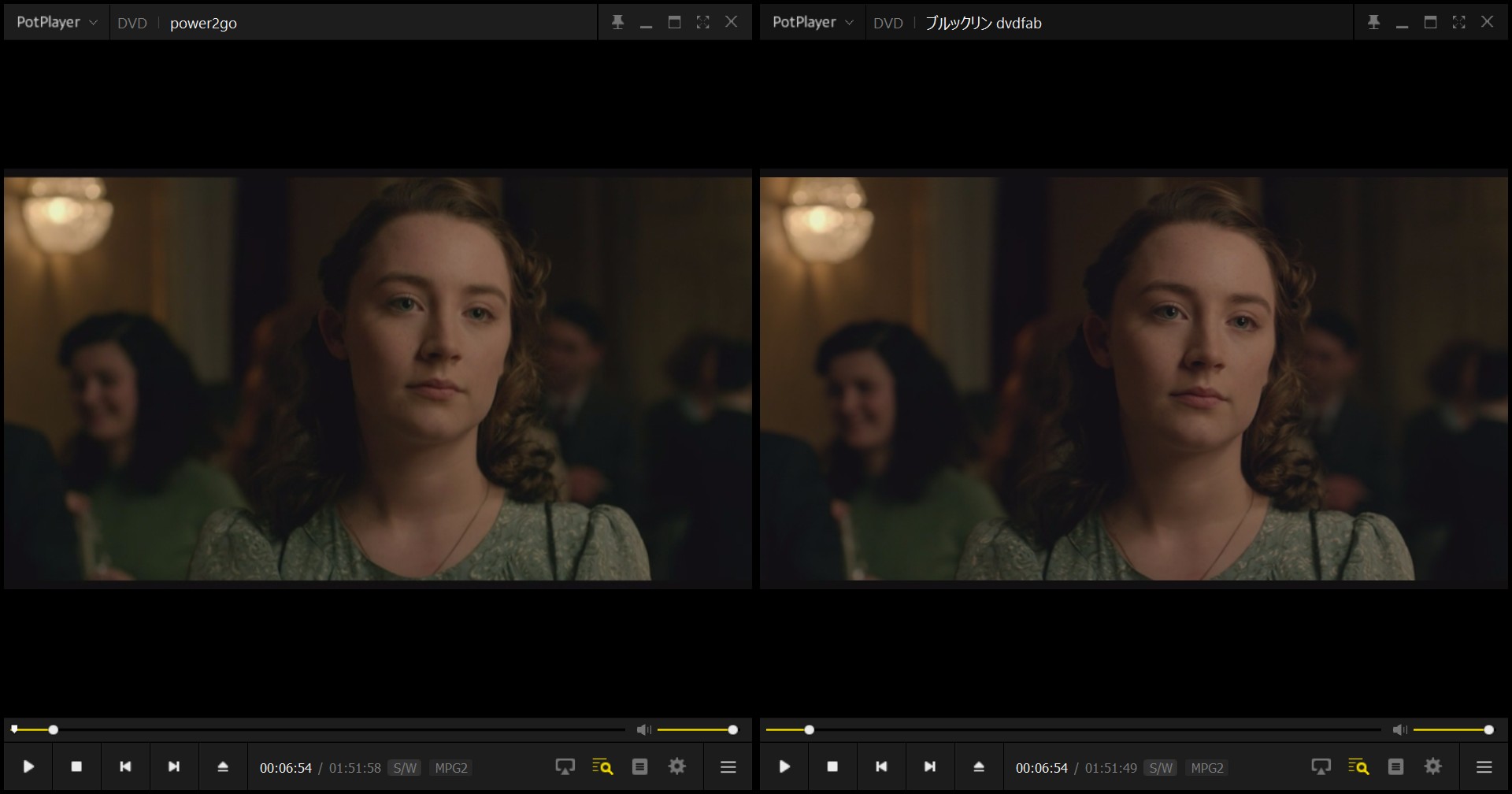 DVDFab DVD 作成は色再現性の面で Power2Goと大きな差が見られ、Power2Goの画面が全体的に灰色がかって見えるのに対し、DVDFabは映画本来の色味をしっかり保っています。