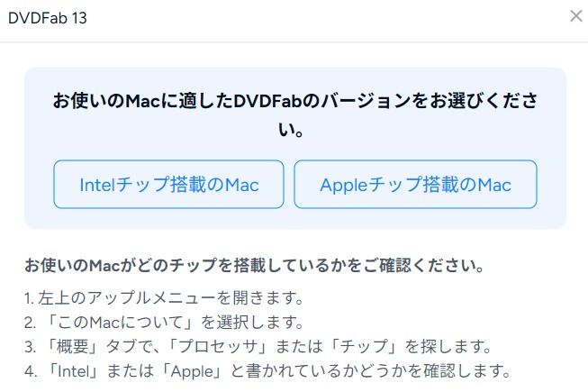 DVDFabはMac向けに、Intel プロセッサー版とApple シリコン ネイティブ版の2種類の専用インストーラを提供しており、お使いのMacがIntel CPUであっても、最新のAppleシリコンであっても、最適なパフォーマンスで確実に動作します。